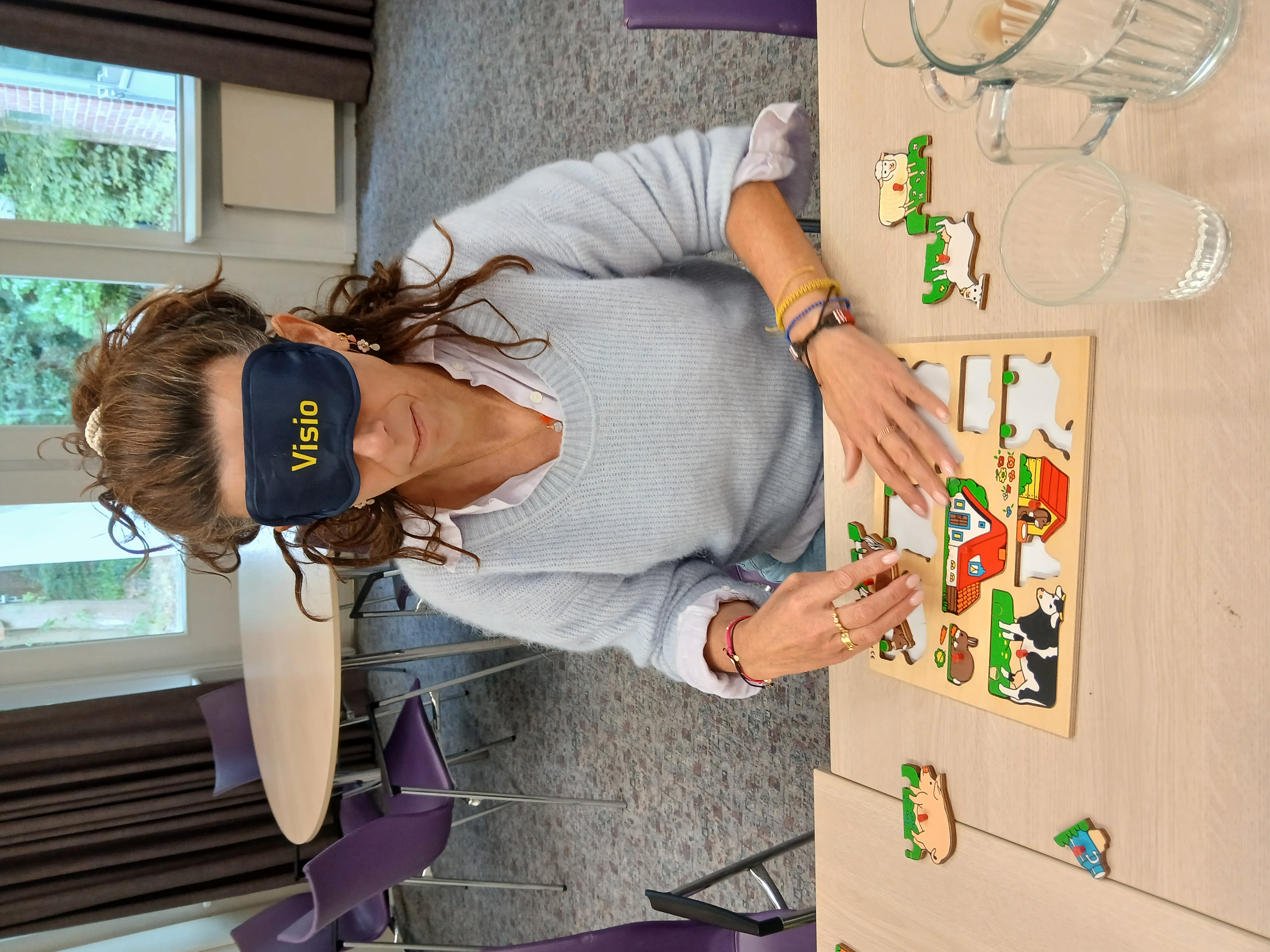 De dag begon met een introductie over Koninklijke Visio en De Blauwe Kamer, gevolgd door ervaringsverhalen van bewoners en een rondleiding langs de aangepaste woningen voor visueel verstandelijk beperkten en het mooie terrein van De Blauwe Kamer. Tijdens workshops ervoeren zorgprofessionals hoe het is om een visuele beperking te hebben, door onder andere het dragen van simulerende brillen, het uitvoeren van blinddoekoefeningen en leren omgaan met een blindenstok. Ook tijdens de lunch, die geblinddoekt plaatsvond, werd het belang van andere zintuigen duidelijk. Deze oefeningen gaven de zorgprofessionals een uniek inzicht in de uitdagingen waar mensen met een visuele beperking dagelijks mee te maken hebben.